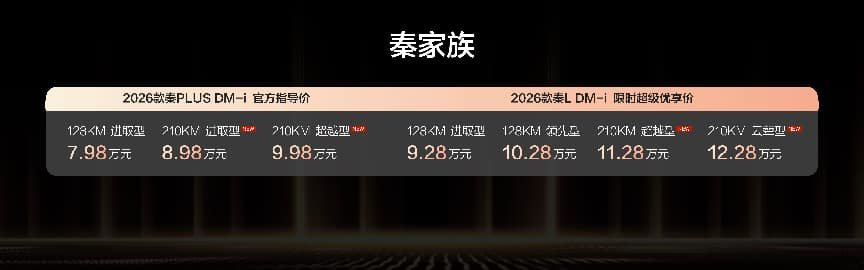 1月8日,比亚迪秦家族迎来重磅加推,2026款秦L DM-i /2026款秦PLUS DM-i 210KM长续航版双车同步上市,售价8.98-12.28万元。其中,2026款秦L DM-i 210KM长续航版限时超级优享价11.28-12.28万元,2026款秦PLUS DM-i 210KM长续航版售价8.98-9.98万元。同时,两款车型均带来了丰厚的上市权益礼。